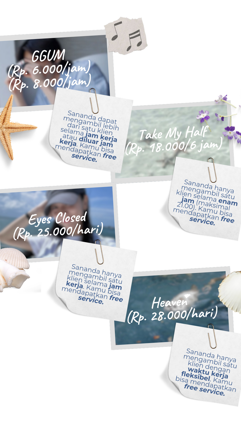 | Klien harus memberi timbal balik berupa testimoni setelah sesi selesai. | Sananda sangat mengutamakan komunikasi, jadi tolong katakan apa yang kamu suka dan tidak suka. Jangan melakukan silent treatment dan passive-aggresive. |